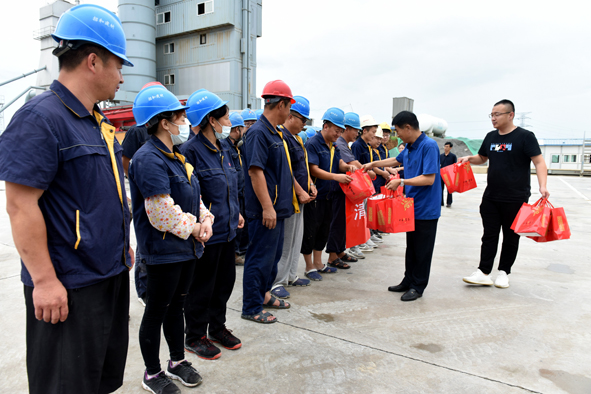 8月6日下午,招遠市總工會黨組書記、常務(wù)副主席王利亭等一行4人到山東金潮股份公司旗下子公司——山東招和環(huán)保建材有限責任公司戶外工作現(xiàn)場,為堅守在烈日和高溫下的一線職工發(fā)放內(nèi)裝茶葉、礦泉水的 “消暑禮包”,并致以親切的慰問。