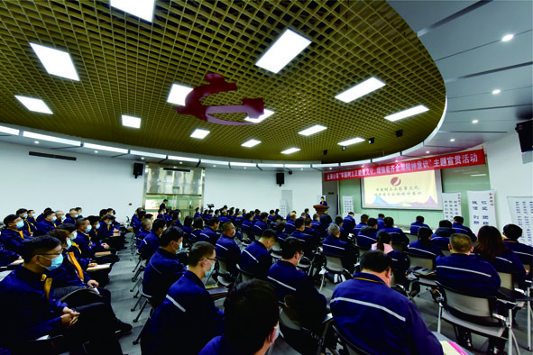本報訊 “‘雄關(guān)漫道真如鐵,而今邁步從頭越’。我們將不忘初心,一如既往,開拓創(chuàng)新,善作善成,以‘海納百川,有容乃大’的胸懷,以 ‘長風破浪會有時,直掛云帆濟滄?!暮狼椋浴匀f漉雖辛苦,吹盡狂沙始到金’的毅力,以‘抓鐵有痕,踏石留印’的精神,以‘眾人劃槳開大船,同舟共濟渡難關(guān)’的斗志,乘‘合伙制’改革的強勁東風,再創(chuàng)新輝煌,續(xù)寫新傳奇,再譜新篇章!” 在2022年新年元旦即將到來之際,12月25日上午,山東金潮控股集團有限公司報告廳二樓會議室座無虛席,宣貫者那鏗鏘有力、擲地有聲、充滿激情的感人話語,以及陣陣熱烈的掌聲響徹大廳。這是公司舉行“牢固樹立正能量文化,增強看齊金潮精神意識”主題宣貫活動的精彩瞬間。董事長程紹華,董事苑永海、彭殿坤、曹雪松,各企業(yè)、各部門主管級以上干部及部分骨干員工200余人參加了宣貫活動。