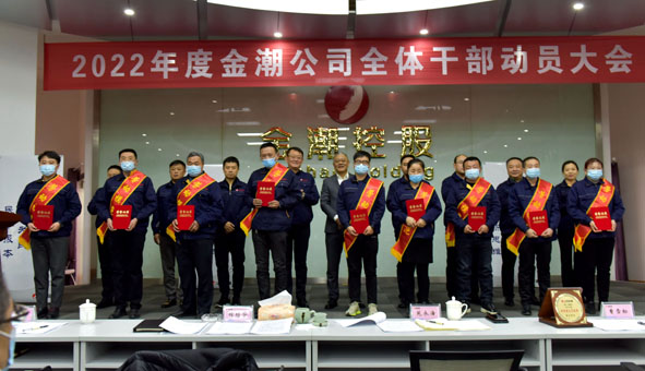 公司行政人事負(fù)責(zé)人王璐首先宣讀了“2021年度特殊重大貢獻(xiàn)獎(jiǎng)、紅旗單位、先進(jìn)團(tuán)隊(duì)、勞動(dòng)模范、優(yōu)秀干部、先進(jìn)工作者的表彰決定”。隨后,公司董事長程紹華宣讀了“關(guān)于對(duì)曹雪松特殊重大貢獻(xiàn)獎(jiǎng)表彰的通報(bào)”,并依次為特殊重大貢獻(xiàn)獎(jiǎng)獲得者曹雪松、紅旗單位獲得企業(yè)金潮地產(chǎn)公司頒獎(jiǎng)并合影。伴隨著歡快的《步步高》樂曲,公司領(lǐng)導(dǎo)先后為獲獎(jiǎng)的先進(jìn)團(tuán)隊(duì)和先進(jìn)個(gè)人頒發(fā)了獎(jiǎng)狀和證書。1時(shí)48分,在熱烈的掌聲中,總裁程紹華作了題為《風(fēng)雨同舟鑄輝煌 和衷共濟(jì)創(chuàng)未來》的2022年度金潮公司全體干部動(dòng)員大會(huì)報(bào)告(全文已發(fā))。簡(jiǎn)要回顧一年來公司的主要工作亮點(diǎn),明確了2022年改革發(fā)展的方向和思路,對(duì)各企業(yè)“合伙制”團(tuán)隊(duì)提出了九項(xiàng)建議和要求,并展望了未來金潮改革發(fā)展的美好前景。
